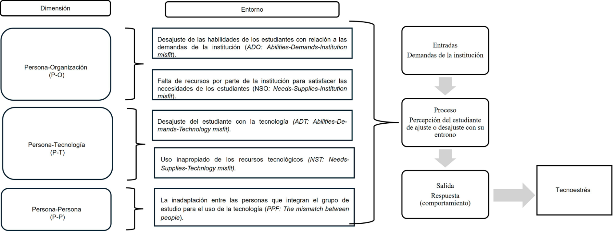 Una teoría que aborda el estudio del tecnoestrés se sustenta en la premisa de que este surge del desajuste entre dos elementos: la persona y el entorno. La perspectiva del desajuste desde un enfoque multidimensional considera que los seres humanos se ven inhibidos por diversos factores; así, el tecnoestrés emerge a partir del desajuste entre el estudiante y las múltiples dimensiones de su entorno.[19] La medición del tecnoestrés en adaptación al español, sustentada en la teoría del ajuste persona-entorno (P-E), parte del supuesto de que este se genera por el desajuste en tres áreas que interactúan: inadaptación persona-organización (P-O), inadaptación persona-tecnología (P-T) e inadaptación de las personas entre sí al momento de usar la tecnología (P-P). En los dos primeros factores se considera la perspectiva de las habilidades y los recursos, como se muestra en la Figura 1.[20]