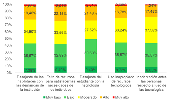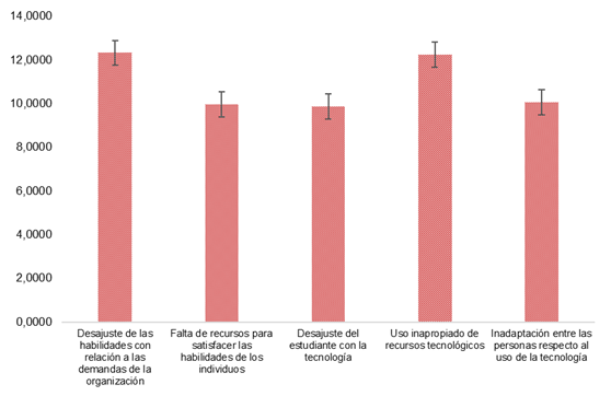 Por otra parte, los resultados muestran que la media que refleja mayor ponderación respecto a los efectos del tecnoestrés es el desajuste de habilidades del estudiantado con relación a las demandas de la institución, mientras que la dimensión que tiene una mayor relación de forma positiva con el tecnoestrés es el uso inapropiado de los recursos tecnológicos, y la que menos incide es el desajuste del estudiante con la tecnología.
