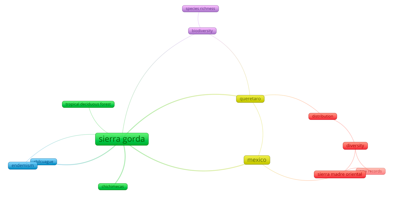 Figura 1. Grafo de coocurrencia de palabras clave de autoría para Sierra Gorda – México