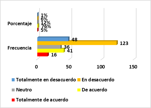 Los resultados evidencian una percepción mayoritaria de insuficiente apoyo y recursos administrativos en la implementación de metodología inclusivas en el aula. Un 65% de los docentes (47% en desacuerdo y 18% totalmente en desacuerdo) manifiesta que no reciben el respaldo adecuado por parte de la administración educativa para llevar a cabo prácticas inclusivas.