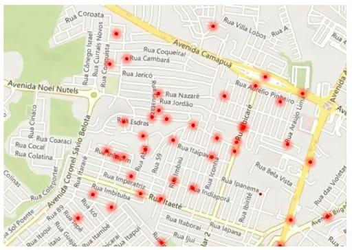 Figura 5 – Imagem georreferenciada localizada da dinâmica espacial dos homicídios no Novo Aleixo em 2024, com as ruas Itaeté, Sávio Belota, Avenida Camapuã e Alameda Alphaville.
