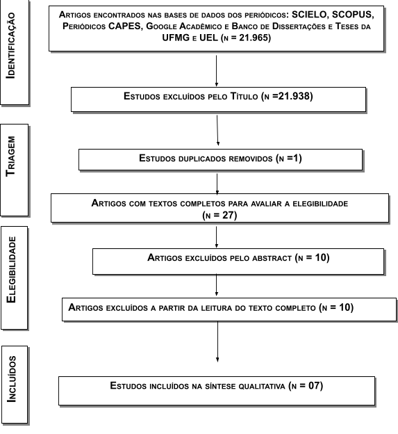 Desse modo, foram selecionados sete artigos sendo incluídos segundo os critérios de elegibilidade conforme a Figura 1. fluxograma e critérios de seleção e inclusão dos trabalhos. Neste caso, os critérios de inclusão foram: artigos nos idiomas inglês, espanhol e português, nos últimos quinze anos, envolvendo as contribuições dos estudos semióticos para compreensão de significados e superação das dificuldades de estudantes nas representações simbólicas científicas: uma revisão. Foram ainda excluídos os capítulos de livro, resumos de eventos, relatos de caso, editoriais, revisões sistemáticas, meta-análises e artigos de opinião.