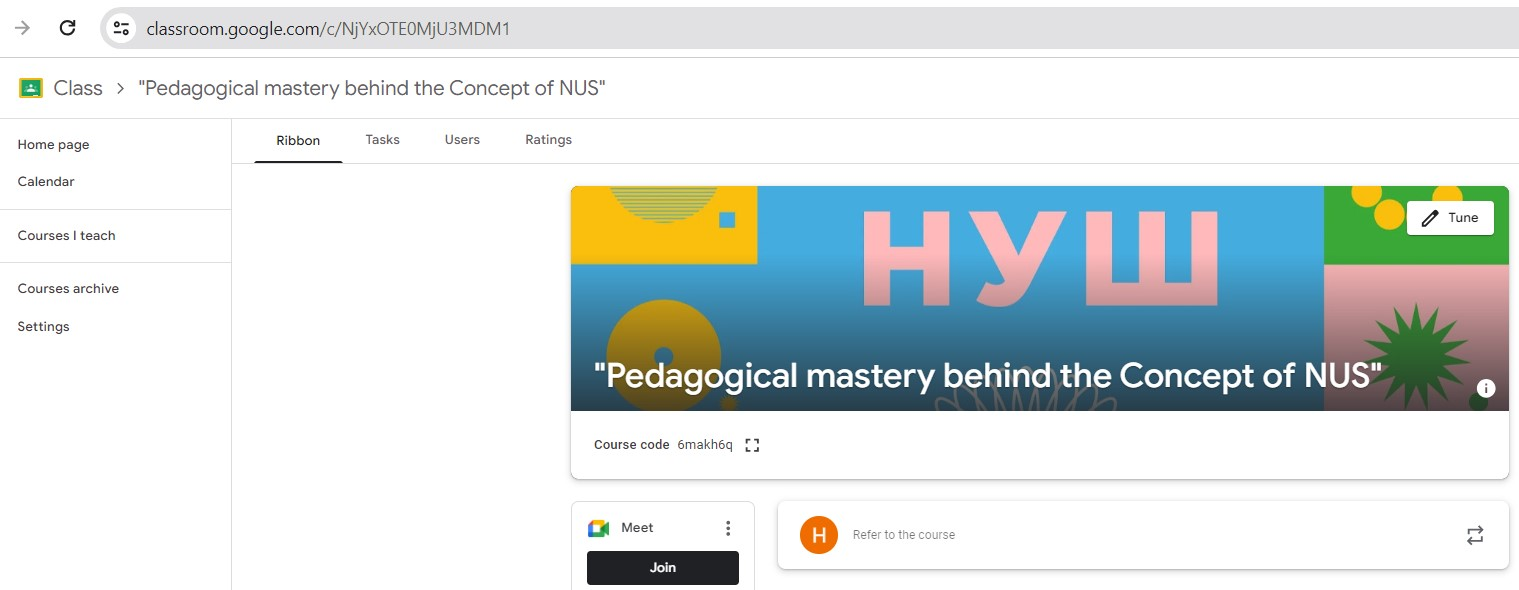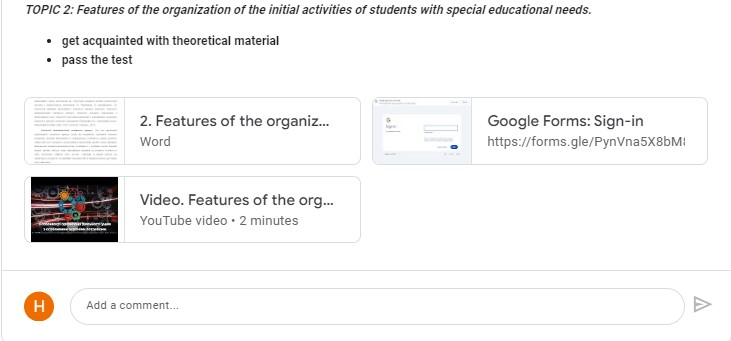 The development of tasks for teaching staff takes into account the possibility of conducting an assessment for all participants or a selective assessment based on the school itself. The electronic resource allows you to set evaluation criteria and the deadline for submission of materials. The section "Users" unites a class of registered teachers in Google based on the automatic import of data from the school website. The rubric "Evaluation" allows the course coordinator (head of the group of teachers) to see the general or summary table of evaluations of all participants for the entire period of study, to receive information about the average evaluation of the group, to make certain samples. For synchronous interaction, the electronic resource provides for the use of the Google meet service for video meetings and calls. The technical capabilities of the GSuite for Education system for the interaction of teachers who work with students involved in inclusive education are directly related to modern digital didactics. In the research of I. Slipukhina, N. Polihun, I. Chernetskyi[1] says that digital didactics is the result of the interaction of psychological-pedagogical, information and digital technologies based on an integrative approach using the method and result of training by all participants of the educational process. According to the modern researches of I. Slipukhina, N. Polihun, I. Chernetsky[2], the concepts of "electronic learning" or "e-learning" and "instrumental digital didactics" are not identical. E-learning involves the use of structured content (presentations, videos, text, etc.), embodied and presented in the form of a sequential training course on an electronic platform. It offers active use of analytical capabilities of software products: mathematical tables, programs for video analysis, tools and software for measurements. E-learning requires the participants of the educational process to possess analytical tools, which are included in the educational tools. Online interaction of pedagogical workers based on the creation of online groups of teachers in Google Class takes into account the fact that group work is combined with their individual work, which is due to the peculiarities of self-education and self-development of teachers. The use of educational modules gives teachers the opportunity to follow an individual educational trajectory at their own pace, to self-monitor the learning outcomes of students involved in inclusive education. We agree with V. Bondar's[3] opinion that the educational module is a part of the educational activity and an information node that unifies the approach to structuring the whole into parts.