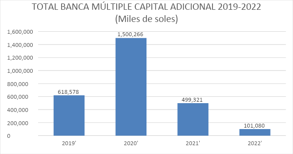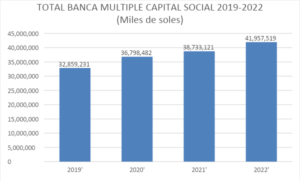 Observamos en el gráfico N°2 que el capital social de la banca múltiple se ha incrementado en el año 2022 en 8.32% respecto al año 2021y en el año 2021 en 5.26% respecto al año 2020.