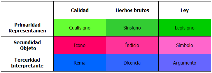 Esta Funcionalidad de (Peirce, C. S. (1998) ha sido interpretada por muchos como una clasificación, sugiere el modo en que ideas más simples se convierten en ideas más complejas. Cada una de las celdas sólo tiene valor en la medida en que se relaciona linealmente con las otras. Es decir, no existen signos cualisígnicos, signos icónicos, signos argumentativos, etc. Lo que se deriva de aquí es una relación tríadica entre categorías; mejor aún, relaciones categoriales, a partir de las cuales Peirce encuentra diez clases de signos: